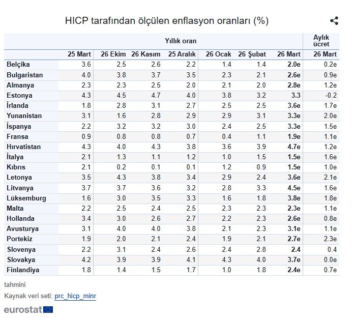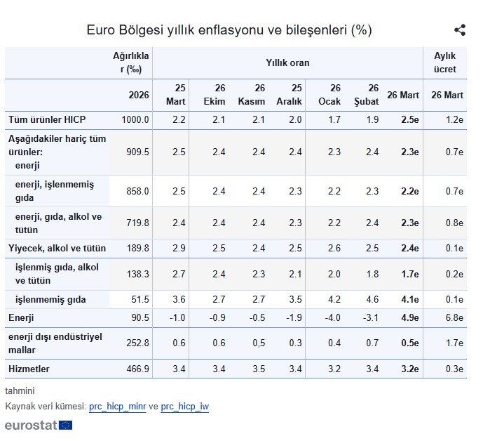 Eurostat yaptığı açıklamada, “Euro Bölgesi'nde yıllık enflasyonun şubat ayındaki %1,9'dan Mart 2026'da %2,5'e yükselmesi bekleniyor” dedi.