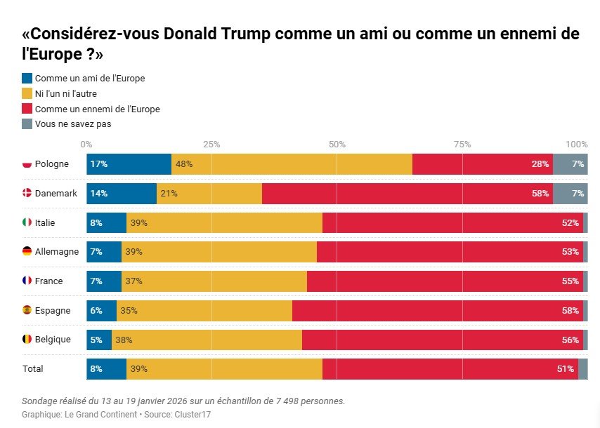 Le Grand Continent dergisi için Cluster 17 Enstitüsü tarafından 13-19 Ocak tarihleri arasında gerçekleştirilen Eurobazooka barometresinin son araştırmasına göre, Avrupalıların %44'ü ABD Başkanı Trump’ın bir “diktatör” gibi davrandığını düşünürken, mutlak çoğunluk (%51) Trump’ı Avrupa'nın "düşmanı" olarak tanımladı.