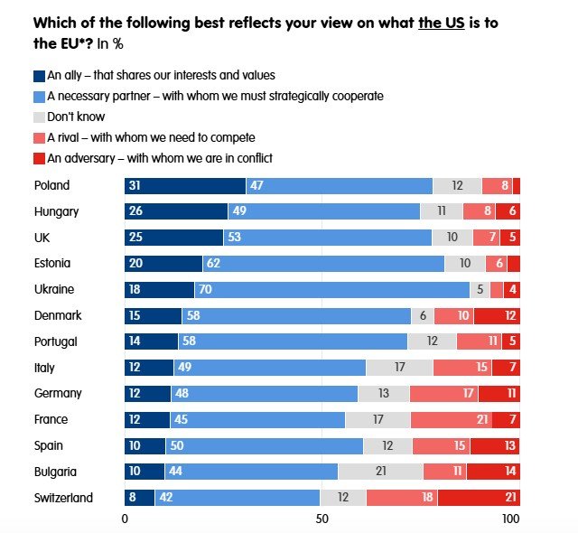 Danimarka (%58), Polonya (%47) ve Birleşik Krallık (%53) gibi güçlü Atlantikçi görüş eğilimlerine rağmen, her ülkede "hakim görüş", Amerika Birleşik Devletleri'nin artık sadece "gerekli bir ortak" olduğudur. Fransa'da ise katılımcıların sadece %12'si Amerika Birleşik Devletleri'ni Avrupa Birliği'nin (AB) "müttefiki" olarak görürken, %45'i "gerekli bir ortak", %21'i "rakip" ve %7'si "düşman" olarak değerlendiriyor.