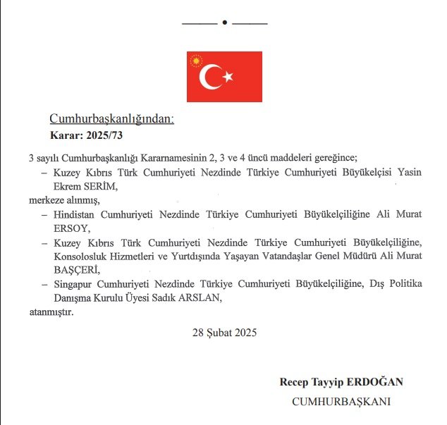 1 Mart tarihli T.C. Resmi Gazetesi’nde 2025/73 numaralı kararla Türkiye Cumhurbaşkanı Erdoğan’ın “Kuzey Kıbrıs Türk Cumhuriyeti Nezdinde Türkiye Cumhuriyeti Büyükelçisi Yasin Ekrem Serim’in merkeze alındığı”, Kuzey Kıbrıs Türk Cumhuriyeti Nezdinde Türkiye Cumhuriyeti Büyükelçiliğine, Konsolosluk Hizmetleri ve Yurtdışında Yaşayan Vatandaşlar Genel Müdürü Ali Murat Başçeri’nin atadığı duyuruldu.