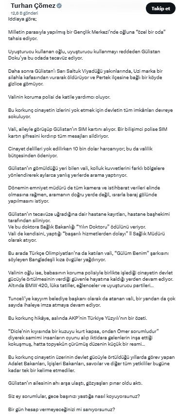 “Yer: Tunceli… AKP’nin Türkiye Yüzyılı’nda bir vali, aynı zamanda başmüfettiş… İddiaya göre; Milletin parasıyla yapılmış bir Gençlik Merkezi’nde oğluna “özel bir oda” tahsis ediyor. Uyuşturucu kullanan oğlu, uyuşturucu kullanmayı reddeden Gülistan Doku’ya bu odada tecavüz ediyor. Daha sonra Gülistan’ı Sarı Saltuk Viyadüğü yakınlarında, Uzi marka bir silahla kafasından vurarak öldürüyor ve Pertek ilçesine bağlı bir köyde gizlice gömüyor. Valinin koruma polisi de katile yardımcı oluyor.