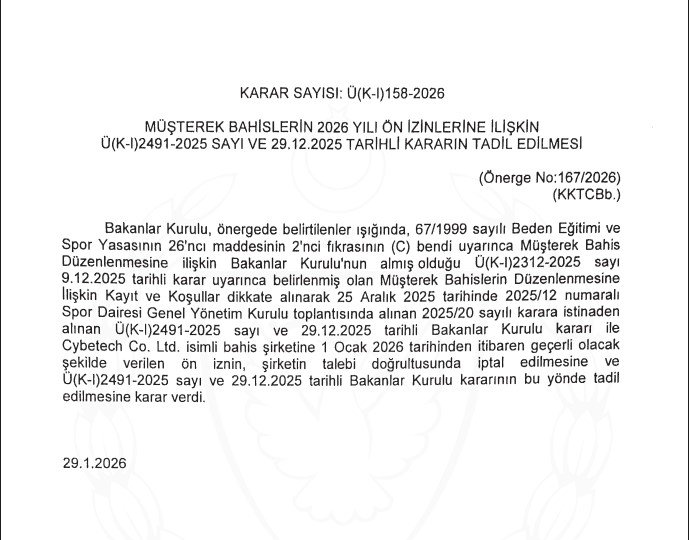 Bakanlar Kurulu, önergede belirtilenler ışığında, 67/1999 sayılı Beden Eğitimi ve Spor Yasasının 2’nci maddesinin 2’nci fıkrasının (C) bendi uyarınca Müşterek Bahis Düzenlenmesine ilişkin Bakanlar Kurulu’nun almış olduğu Ü(K-I)2312-2025 sayı 9.12.2025 tarihli karar uyarınca belirlenmiş olan Müşterek Bahislerin Düzenlenmesine ilişkin Kayıt ve Koşullar dikkate alınarak 25 Aralık 2025 tarihinde 2025/12 numaralı Spor Dairesi Genel Yönetim Kurulu toplantısında alınan 2025/20 sayılı karara istinaden alınan Ü(K-I)2491-2025 sayı ve 29.12.2025 tarihli Bakanlar Kurulu kararı ile Cybetech Co. Ltd. isimli bahis şirketine 1 Ocak 2026 tarihinden itibaren geçerli olacak şekilde verilen ön iznin, şirketin talebi doğrultusunda iptal edilmesi ve Ü(K-I)2491-2025 sayı ve 29.12.2025 tarihli Bakanlar Kurulu kararının bu yönde tadil edilmesine karar verdi.