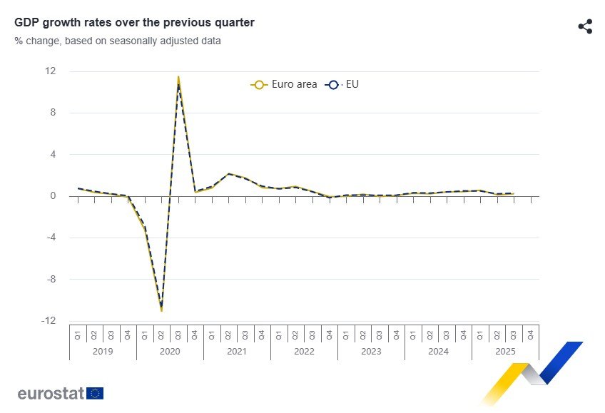 Avrupa Birliği İstatistik Ofisi Eurostat tarafından yayınlanan ön tahminlere göre, 2025'in üçüncü çeyreğinde mevsimsellikten arındırılmış GSYİH, bir önceki çeyreğe kıyasla Avro Bölgesi'nde %0,2, AB'de ise %0,3 arttı. 2025'in ikinci çeyreğinde ise GSYİH, Avro Bölgesi'nde %0,1, AB'de ise %0,2 artmıştı.