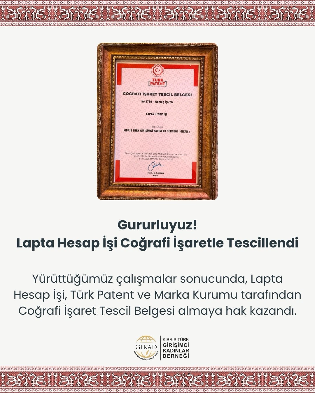 Girne Emekçi Kadınlar Kooperatifinden yapılan açıklamaya göre, etkinlik kapsamında, yüzyıllardır özellikle Laptalı kadınlar tarafından sürdürülen Lapta Hesap İşi’nin coğrafi işaret tescil belgesi, süreci başından sonuna kadar yürüterek patent başvurusunu tamamlayan Girişimci Kadınlar Kalkınma Derneği’ne (GİKAD) sunuldu.