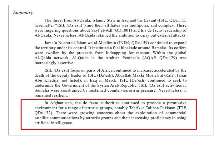 Birleşmiş Milletler de yakın zamanda yayınladığı bir raporda, Afgan hükümetinin ülkedeki çeşitli terör grupları için elverişli bir ortam sağladığını ve Pakistan Talibanı'nı desteklediğini yazıyor.