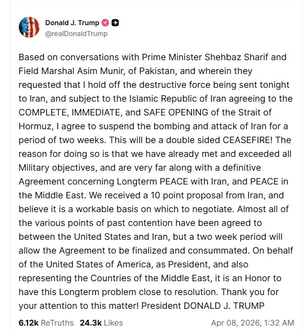 "Pakistan Başbakanı Şehbaz Şerif ve Pakistan Kara Kuvvetleri Komutanı Asım Munir ile yaptığım görüşmeler doğrultusunda ve kendilerinin bu gece İran’a gönderilmekte olan yıkıcı gücü durdurmamı talep etmeleri üzerine, ayrıca İran İslam Cumhuriyeti’nin Hürmüz Boğazı’nın TAM, DERHAL ve GÜVENLİ biçimde açılmasını kabul etmesi şartıyla, İran’a yönelik bombardımanı ve saldırıyı iki haftalık bir süre için askıya almayı kabul ediyorum. Bu, iki taraflı bir ATEŞKES olacaktır! Bunu yapmamızın nedeni, tüm askerî hedeflere zaten ulaşmış ve hatta bunları aşmış olmamız; ayrıca İran’la uzun vadeli BARIŞ ve Orta Doğu’da BARIŞ konusunda kesin bir anlaşmaya oldukça yaklaşmış bulunmamızdır. İran’dan 10 maddelik bir öneri aldık ve bunun müzakere edilebilir bir temel oluşturduğuna inanıyoruz. Geçmişte anlaşmazlık konusu olan çeşitli başlıkların neredeyse tamamında Amerika Birleşik Devletleri ile İran arasında uzlaşı sağlandı; ancak iki haftalık süre, anlaşmanın tamamlanmasına ve resmiyet kazanmasına imkân verecektir. Amerika Birleşik Devletleri adına, Başkan olarak ve ayrıca Orta Doğu ülkelerini de temsilen, bu uzun süreli sorunun çözüme bu kadar yaklaşmış olmasından onur duyuyorum."