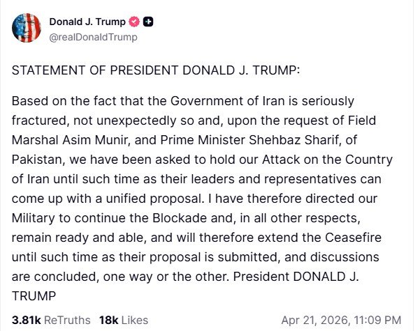Trump sosyal medya hesabından yaptığı paylaşımda, "İran Hükümeti’nin ciddi biçimde bölünmüş olduğu gerçeğine dayanarak -ki bu beklenmedik bir durum değildir- ve Pakistan Kara Kuvvetleri Mareşali Asim Munir ile Başbakan Şahbaz Şerif’in talebi üzerine, İran ülkesine yönelik saldırımızı, liderleri ve temsilcileri birleşik bir teklif ortaya koyana kadar durdurmamız istendi. Bu nedenle ordumuza ablukayı sürdürmesi ve diğer tüm açılardan hazır ve muktedir durumda kalması yönünde talimat verdim; bu çerçevede ateşkesi de, söz konusu teklif sunulana ve görüşmeler bir şekilde sonuçlanana kadar uzatacağım" ifadelerini kullandı.