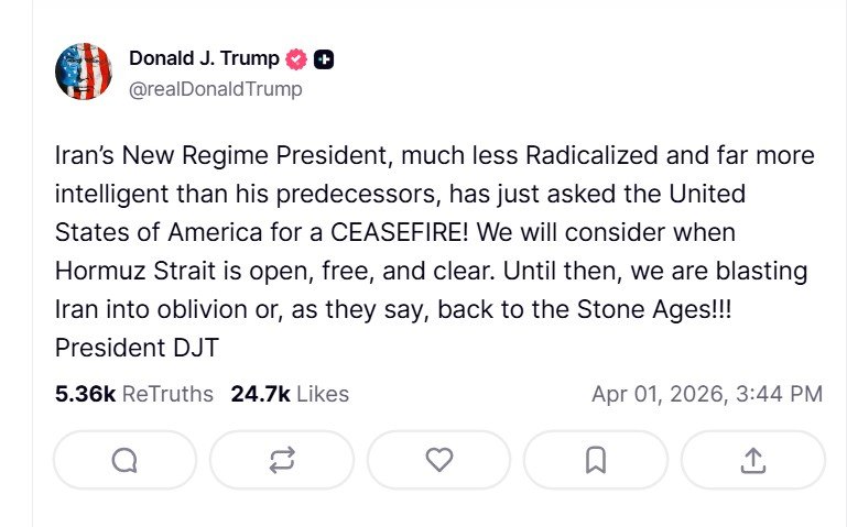 Trump şöyle yazdı: “İran’ın yeni rejim başkanı, önceki liderlerine göre çok daha az radikalleşmiş ve çok daha akıllı; az önce Amerika Birleşik Devletleri’nden bir ATEŞKES talebinde bulundu! Hürmüz Boğazı açık, serbest ve güvenli hale geldiğinde bunu değerlendireceğiz. O zamana kadar İran’ı yok oluşa sürüklüyoruz ya da onların deyimiyle Taş Devri’ne geri gönderiyoruz!!!”