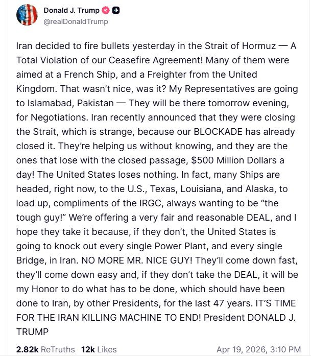 “Iran dün Hürmüz Boğazı’nda mermi ateşlemeye karar verdi — Ateşkes Anlaşmamızın Tam Bir İhlali! Bunların çoğu bir Fransız Gemisini ve Birleşik Krallık’tan bir Yük Gemisini hedef aldı. Bu hoş değildi, öyle değil mi? Temsilcilerim Pakistan’ın İslamabad kentine gidiyor — Yarın akşam Müzakereler için orada olacaklar. Iran kısa süre önce Boğazı kapattığını açıkladı, bu tuhaf, çünkü bizim ABLUKAMIZ zaten burayı kapatmış durumda. Farkında olmadan bize yardım ediyorlar ve kapalı geçişten kaybeden de onlar oluyor, günde 500 Milyon Dolar! Amerika Birleşik Devletleri hiçbir şey kaybetmiyor. Aslında şu anda birçok Gemi, yük almak üzere ABD’ye, Texas’a, Louisiana’ya ve Alaska’ya doğru yola çıkmış durumda; hepsi de IRGC’nin [İran Devrim Muhafızlar Ordusu] her zaman “sert adam” olmak istemesinin bir sonucu! Çok adil ve makul bir ANLAŞMA teklif ediyoruz ve umarım kabul ederler çünkü etmezlerse, Amerika Birleşik Devletleri Iran’daki her bir Elektrik Santralini ve her bir Köprüyü yok edecek. ARTIK BAY İYİ ADAM YOK! Hızla geri adım atacaklar, kolayca geri adım atacaklar ve eğer ANLAŞMAYI kabul etmezlerse, yapılması gerekeni yapmak benim için bir Onur olacak; ki bu, son 47 yıldır diğer Başkanlar tarafından Iran’a yapılmalıydı. IRAN ÖLDÜRME MAKİNESİNİN SONA ERMESİNİN ZAMANI GELDİ!”