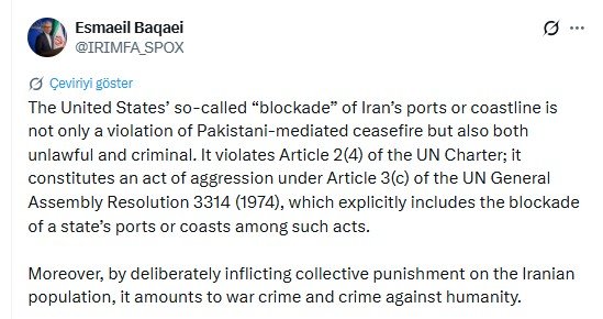 "Amerika Birleşik Devletleri’nin İran limanlarına ya da kıyı şeridine yönelik sözde “ablukası”, yalnızca Pakistan aracılığıyla sağlanan ateşkesin ihlali değil, aynı zamanda hem hukuka aykırı hem de suç niteliğindedir. Bu durum, BM Şartı’nın 2(4). maddesini ihlal etmektedir; ayrıca BM Genel Kurulu’nun 3314 (1974) sayılı Kararı’nın 3(c) maddesi uyarınca bir saldırı fiili teşkil etmektedir; söz konusu madde, bir devletin limanlarının veya kıyılarının ablukaya alınmasını açıkça bu tür fiiller arasında saymaktadır.