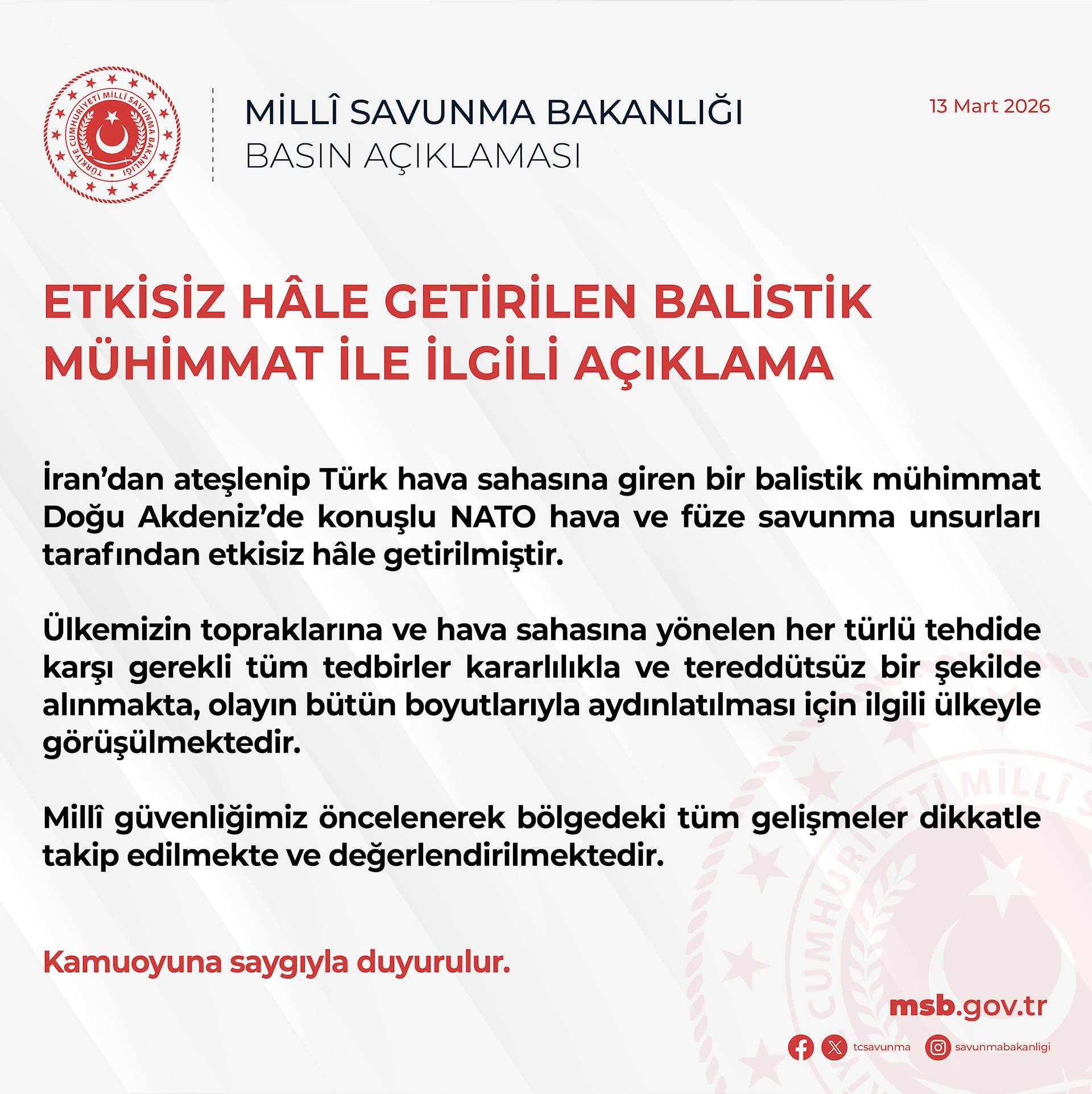 Türkiye Milli Savunma Bakanlığı (MSB) konuyla ilgili yaptığı açıklamada, “İran’dan ateşlenip Türk hava sahasına giren bir balistik mühimmat Doğu Akdeniz’de konuşlu NATO hava ve füze savunma unsurları tarafından etkisiz hâle getirildiğini” bildirdi.