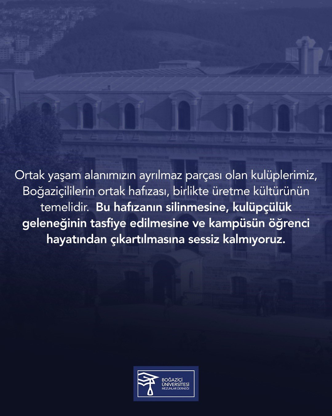 Mezunlar Derneği, öğrenci kulüplerinin kampüsün ortak yaşam alanının ayrılmaz bir parçası olduğunu vurgulayarak, “Boğaziçililerin ortak hafızası” olarak tanımladığı kulüp kültürünün tasfiye edilmesine karşı çıkmıştı. “Bu hafızanın silinmesine, kulüpçülük geleneğinin tasfiye edilmesine ve kampüsün öğrenci hayatından çıkartılmasına sessiz kalmıyoruz” denilerek, kulüp odalarının boşaltılmasına yönelik kararlara itiraz açık biçimde dile getirilmişti.