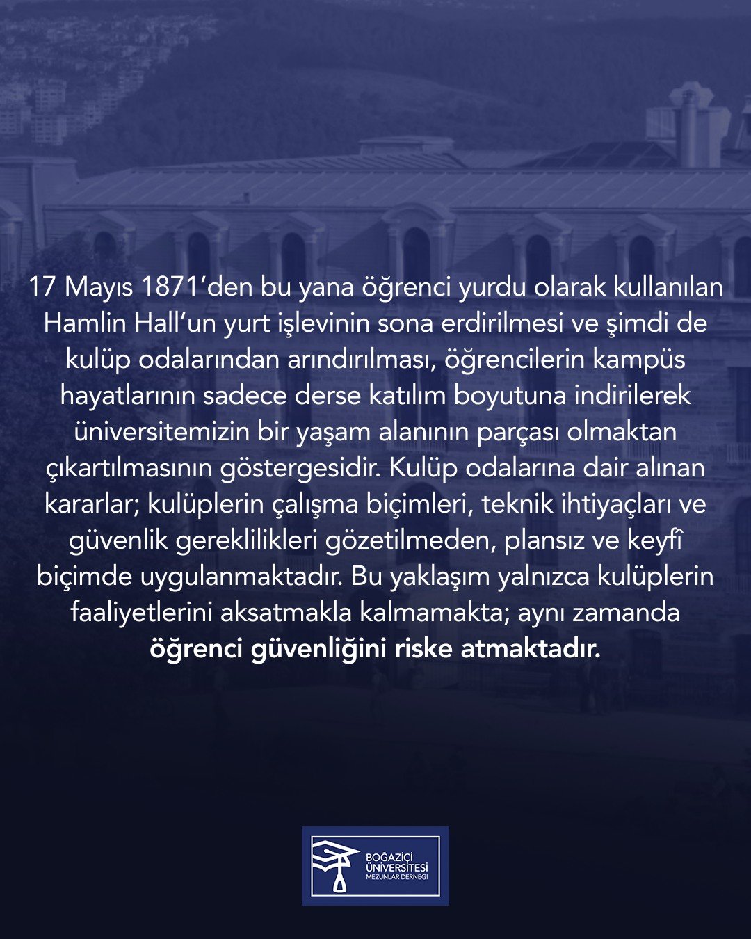 Üniversitenin Güney Kampüsü'ndeki 'Hamlin Hall' binasının 1871’den bu yana süren yurt işlevinin sona erdirilmesinin ardından, binanın kulüp odalarından da arındırılmasına yönelik adımlara Boğaziçi Üniversitesi Mezunlar Derneği tepki göstermiş, Hamlin Hall’un yalnızca bir bina değil, kampüs yaşamının ve öğrencilik deneyiminin önemli bir parçası olduğuna dikkat çekerek, alınan kararların öğrencilerin kampüs hayatını “sadece derse katılım” düzeyine indirgediği vurgulanmıştı.