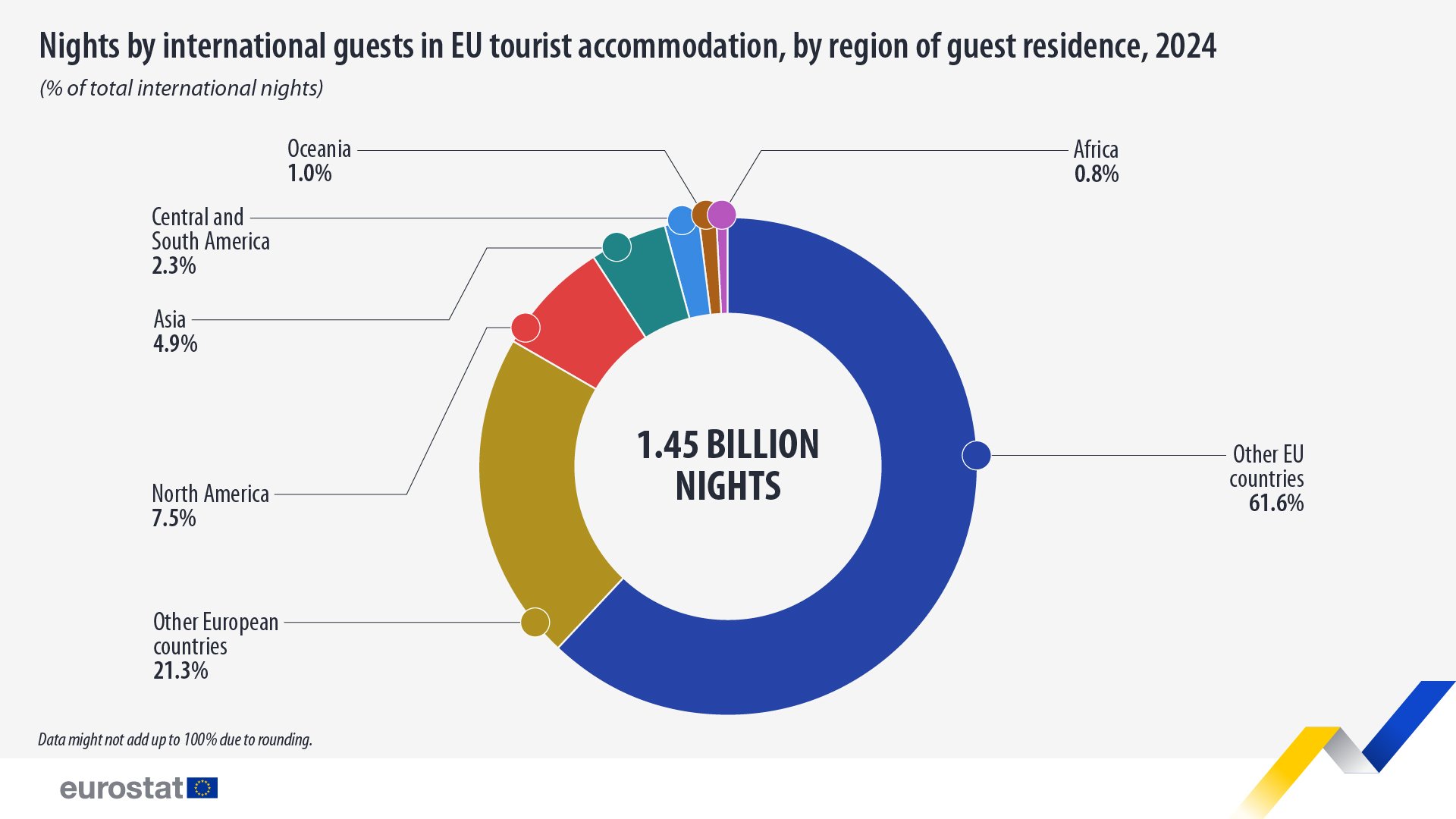 Avrupa Birliği genelinde kaydedilen 3,02 milyar gecelemenin büyük bölümü, ülkelerin kendi vatandaşları tarafından yapılan yerli konaklamalardan oluştu (%51,9; 1,57 milyar gece). Geriye kalan %48,1’lik (1,45 milyar) kısım ise uluslararası ziyaretçilerden oluştu.