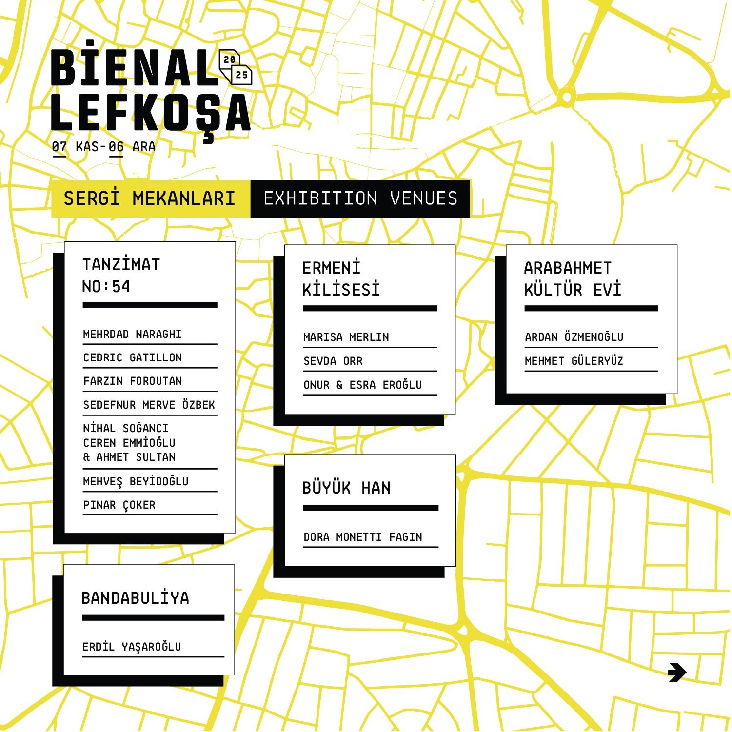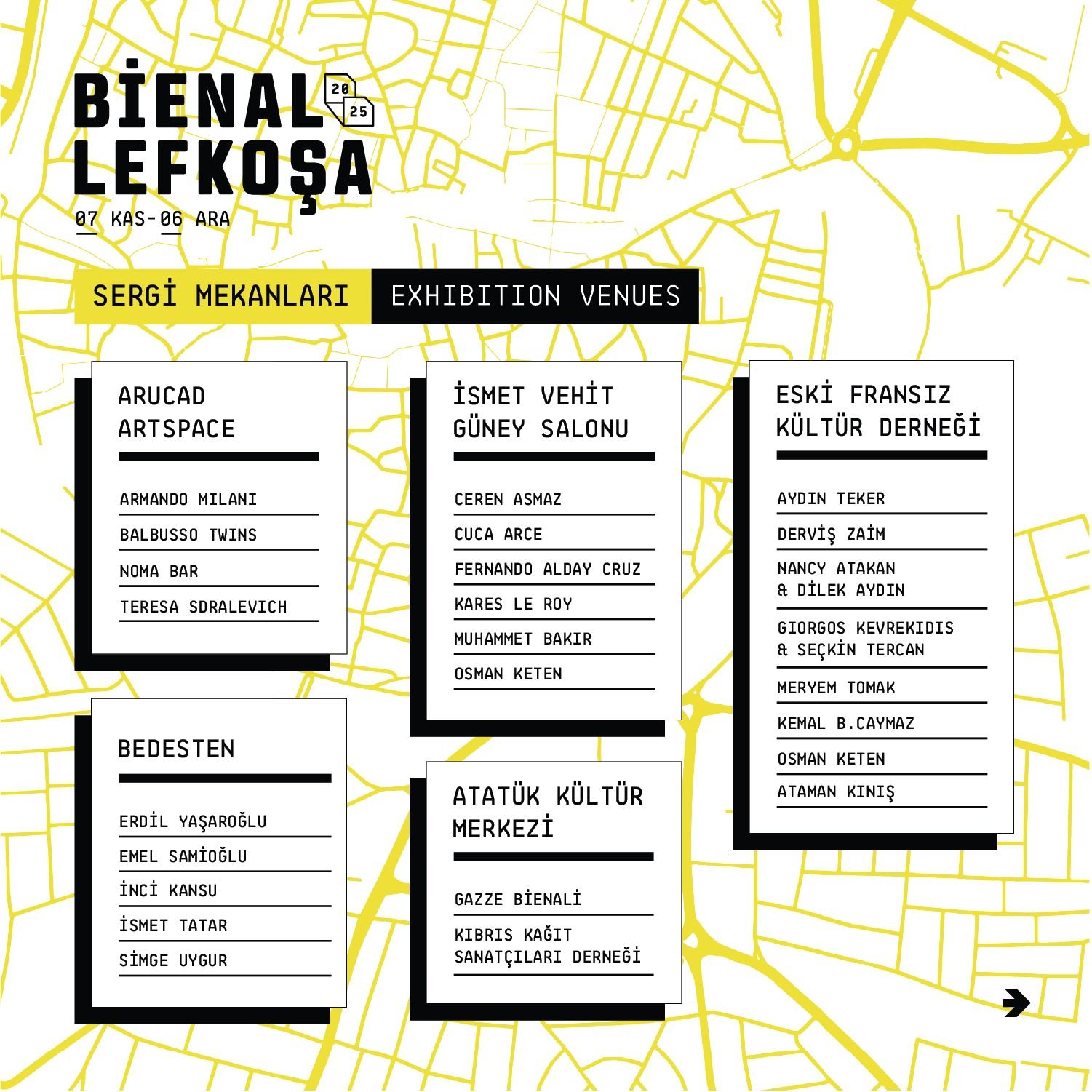 Bienal süresince İsmet Vehit Güney Sanat Merkezi, Atatürk Kültür Merkezi, ARUCAD Artspace, Büyük Han, Bedesten, Bandabuliya, Tanzimat 54, Eski Fransız Kültür Derneği, Ermeni Kilisesi ve Arabahmet Kültür Evi gibi Lefkoşa’nın sembolik mekânları, “Merhamet” temasını farklı sanat disiplinlerinde yorumlayan eserlerle ziyaretçilere açık olacak.