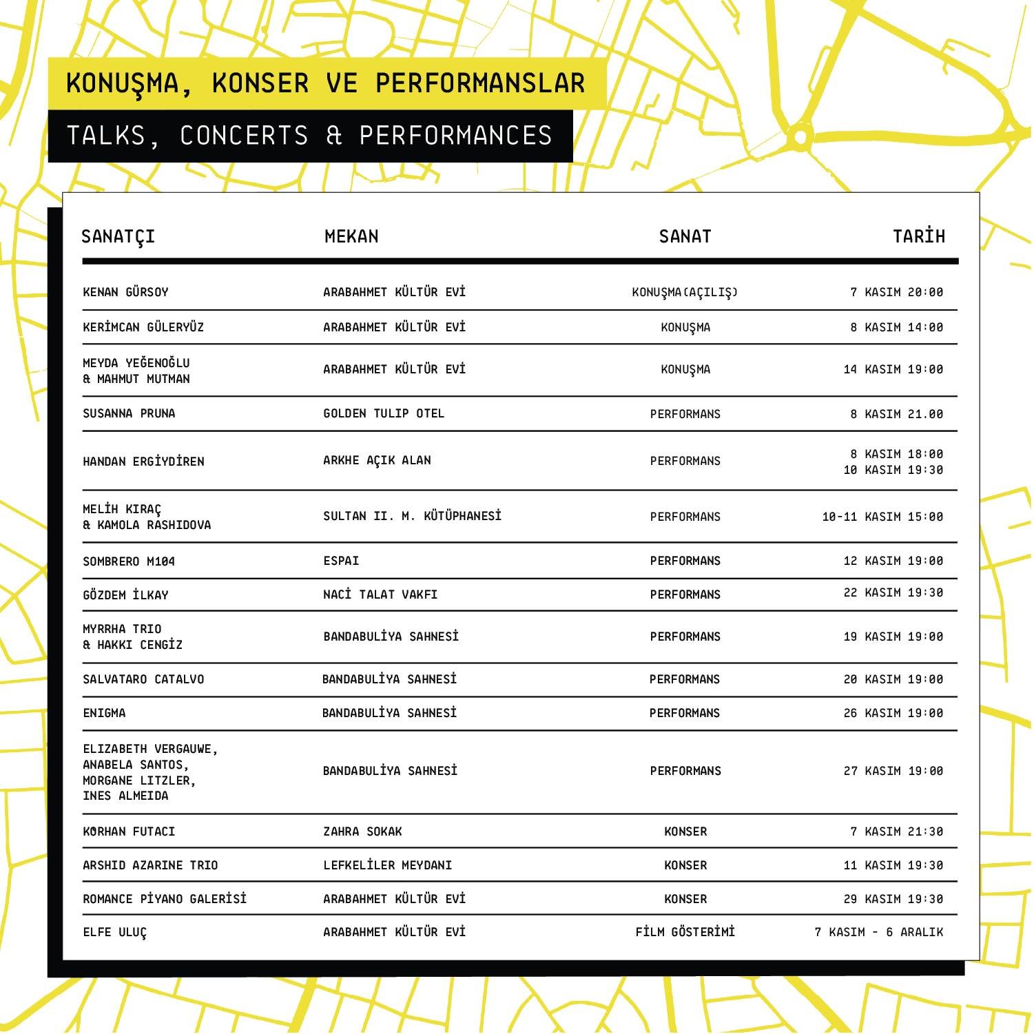 Bienal boyunca her cumartesi 10.30–14.30 saatleri arasında düzenlenecek ücretsiz rehberli turlar, ziyaretçilere sergi alanlarını ve kamusal yerleştirmeleri Türkçe ve İngilizce olarak tanıma olanağı sağlayacak.