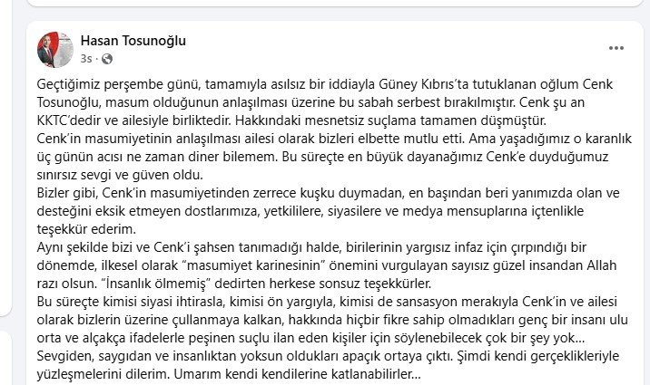 “Geçtiğimiz perşembe günü, tamamıyla asılsız bir iddiayla Güney Kıbrıs’ta tutuklanan oğlum Cenk Tosunoğlu, masum olduğunun anlaşılması üzerine bu sabah serbest bırakılmıştır. Cenk şu an KKTC’dedir ve ailesiyle birliktedir. Hakkındaki mesnetsiz suçlama tamamen düşmüştür.