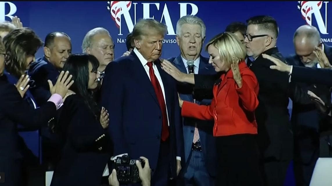 Ekran görüntüsü: 28 Ekim 2024’te Atlanta’da papazlar Donald Trump’ın etrafında dua ediyor.
