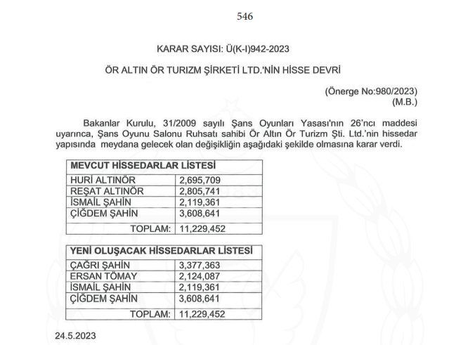 Gazeteci, daha önce Mikro-Makro’nun ilk kez gündeme getirdiği 25 Mayıs 2023 tarihli KKTC Resmi Gazetesi’nde yayımlanan, Altınör ailesi hisselerinin Şahin ailesine geçtiğini gösteren Bakanlar Kurulu kararını yayımladı. Ör Altın Ör Turizm Şirketi'nin hisselerini devralan isimler arasında yer alan Veysel Şahin’in yeğeni Çağrı Şahin’e, diğer akrabaları İsmail Şahin, Çiğdem Şahin’e ve Ersan Tömay’a dikkat çeken Ağırel, Mikro-Makro’nun gündeme getirdiği Chamada Hotel’e kaçak bina çıkıldığı iddialarını da hatırlattı.
