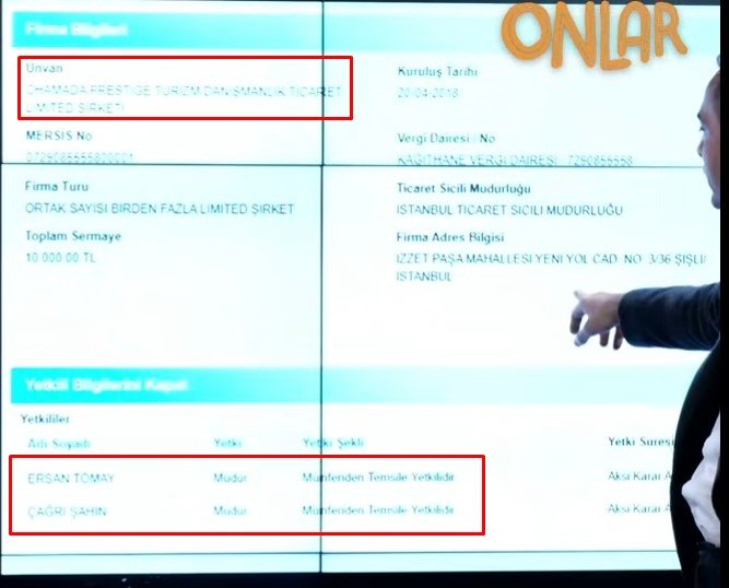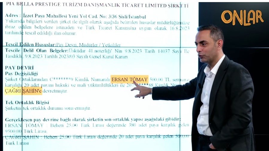 Ağırel, PIA BELLA’nın ortaklarından birinin Ersan Tömay olduğunu, bu ismin daha önce Chamada Otel’in yönetim kurulu listesinde de yer aldığını hatırlattı. Ağırel’in programda gösterdiği belgelere dayanarak şirket hisselerinin Ersan Tömay’dan Çağrı Şahin’e devredildiğini, ardından PIA BELLA’nın isminin değiştirilerek “Chamada” adını aldığını ve yöneticilerinin de Çağrı Şahin ve Ersan Tömay olarak geçtiğini belgesiyle gösterdi.
